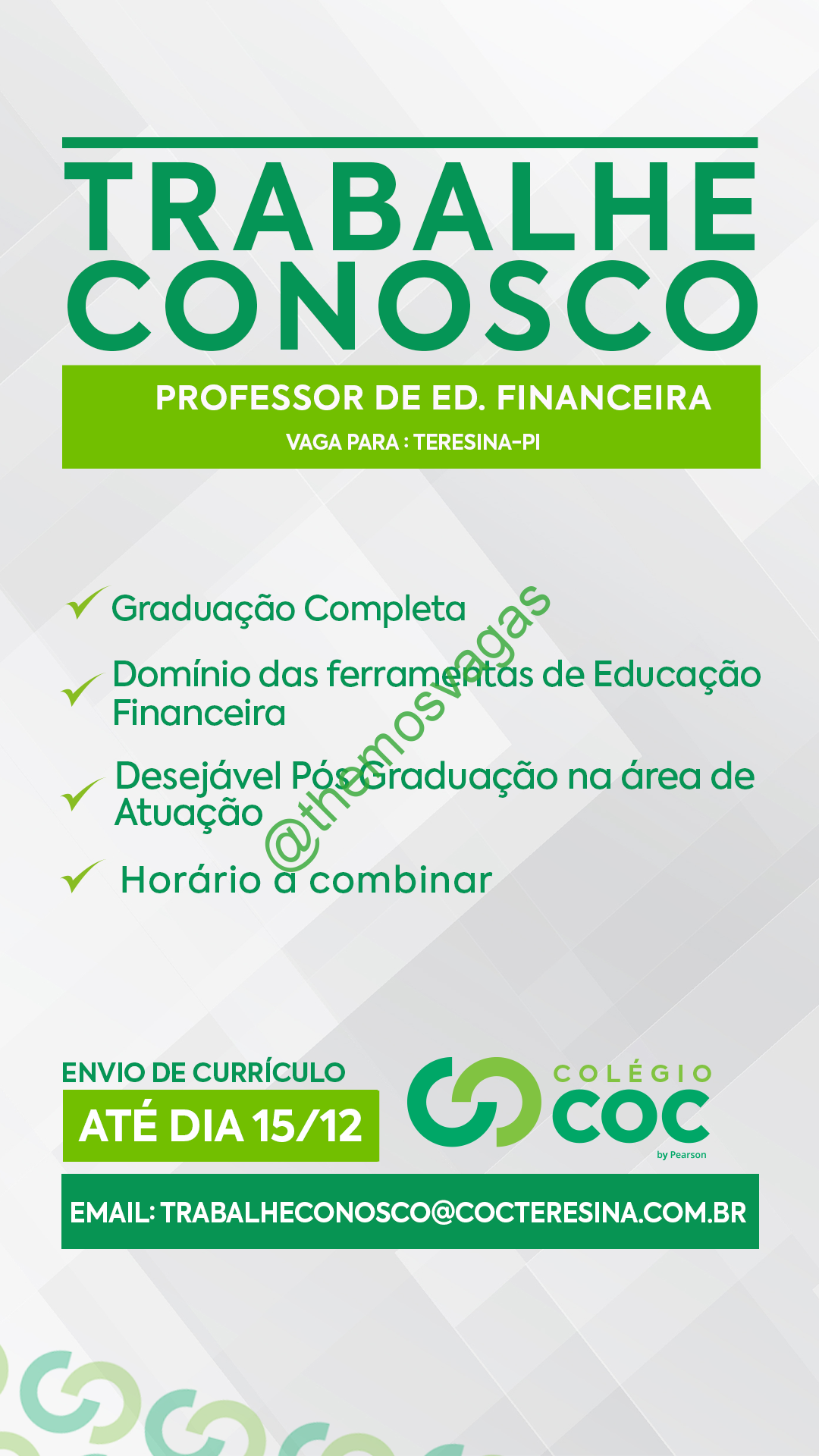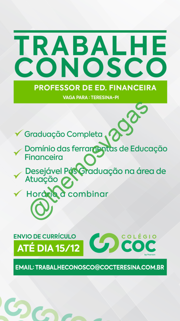 – Interessados(as) e que atendam ao perfil solicitado acima, devem enviar o currículo até 15/12/2019 para o e-mail trabalheconosco@cocteresina.com.br contendo no título/assunto “Professor de Educação Financeira THE