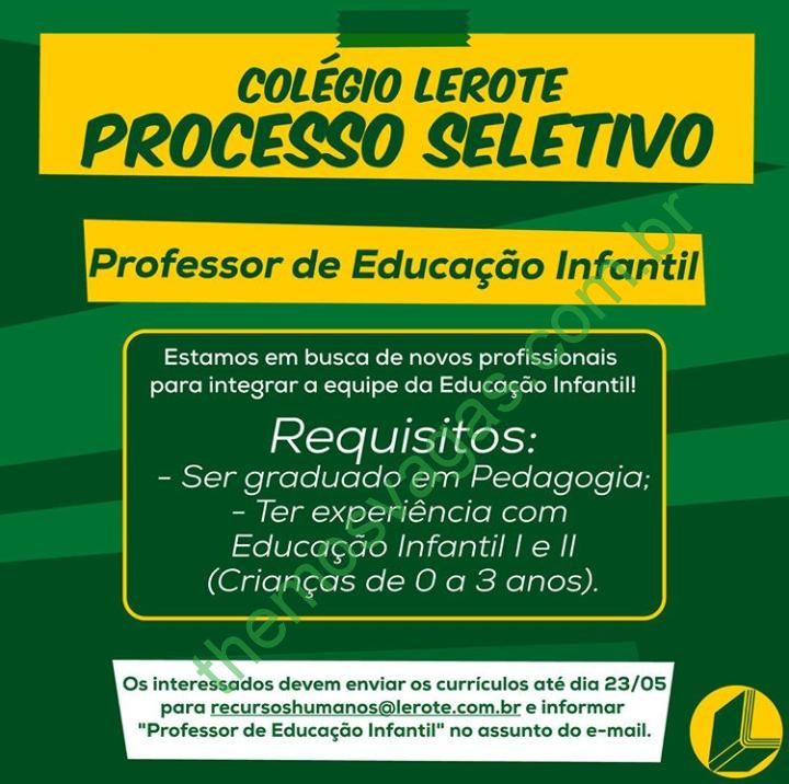– Interessados(as) e que atendam aos requisitos devem enviar o perfil profissional até o dia 23/05/2019, colocando no título do e-mail “Professor de Educação Infantil”, para: recursoshumanos@lerote.com.br