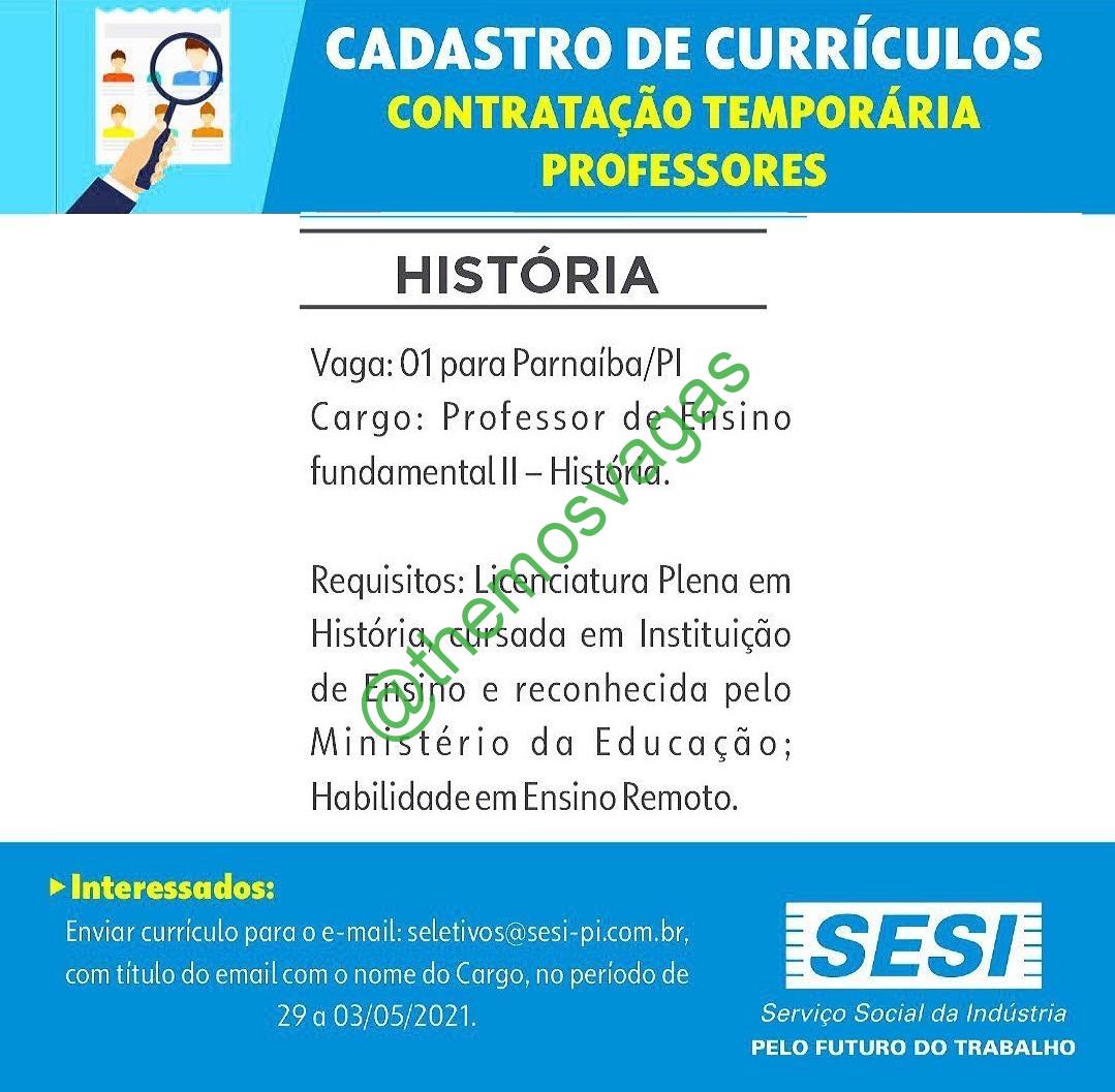 – Interessados(as) e que atendam ao perfil solicitado acima, devem enviar o currículo até 03/05/2021 para o e-mail seletivos@sesi-pi.com.br contendo no título/assunto “Professor de História PHB