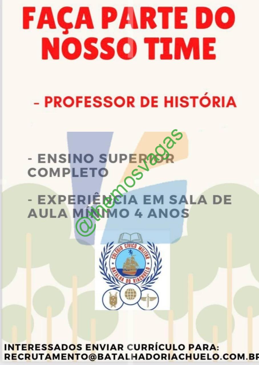 – Interessados(as) e que atendam ao perfil solicitado acima, devem enviar o currículo para o e-mail recrutamento@batalhadoriachuelo.com.br , contendo no título/assunto “Professor de História – FOR“.