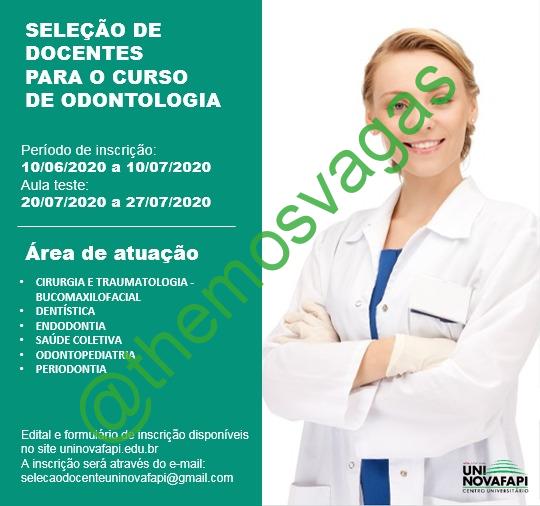 – Interessados(as) e que atendam ao perfil solicitado acima, consultar edital e formulário no site da Uninovafapi e enviar até 10/07/2020 para selecaodocenteuninovafapi@gmail.com contendo no título/assunto “Professor de Odontologia THE