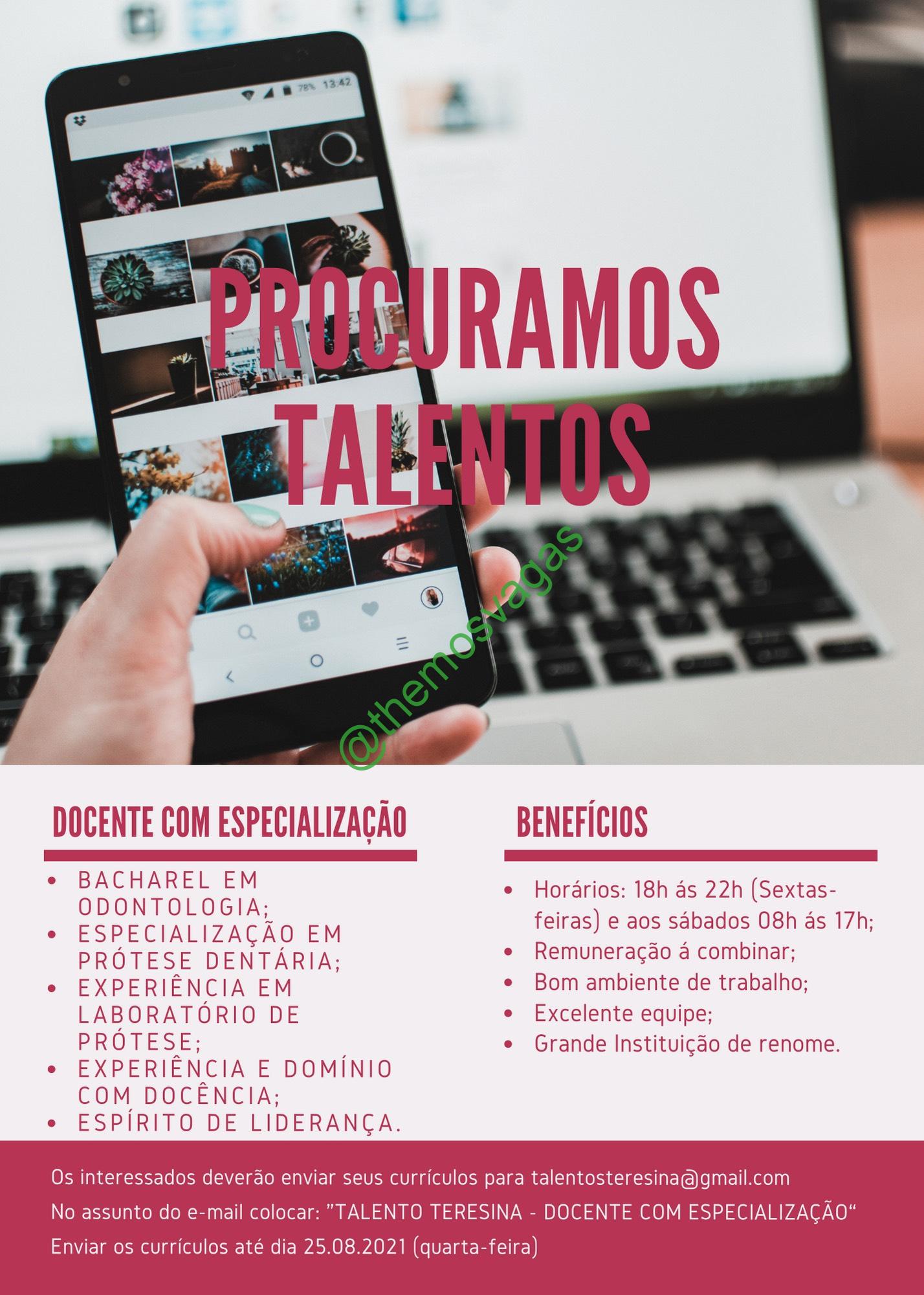 – Interessados(as) e que atendam ao perfil solicitado acima, devem enviar o currículo até 25/08/2021 para o e-mail talentosteresina@gmail.com, contendo no título/assunto “Talento Teresina – Docente com especialização“.