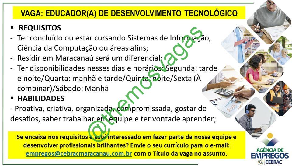 – Interessados(as) e que atendam ao perfil solicitado acima, devem enviar o currículo para o e-mail empregos@cebracmaracanau.com.br , colocando no título “Educador(a) de Desenvolvimento Tecnológico”.