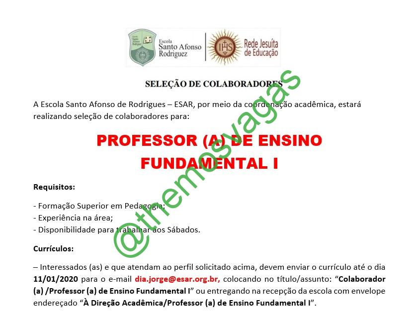 – Interessados(as) e que atendam ao perfil solicitado acima, devem enviar o currículo até 11/01/2020 para o e-mail dia.jorge@esar.org.br contendo no título/assunto “Colaborador(a)/Professor(a) de Ensino Fundamental I” ou entregar na recepção da escola com envelope endereçado “À Direção Acadêmica/Professor(a) de Ensino Fundamental I”.