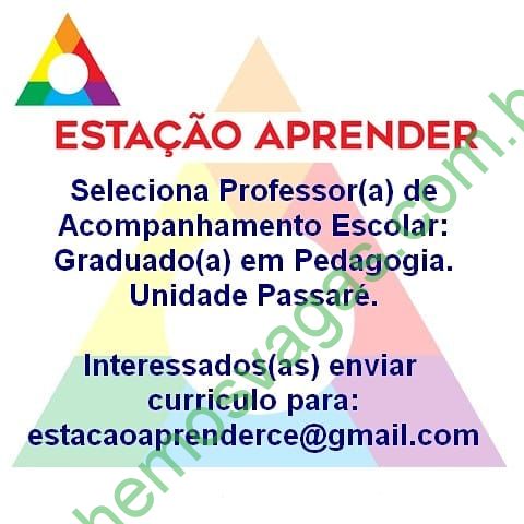 – Interessados(as) e que atendam ao perfil solicitado acima, devem enviar o currículo para o e-mail estacaoaprenderce@gmail.com colocando no título “Professor de Acompanhamento Escolar – FOR”.