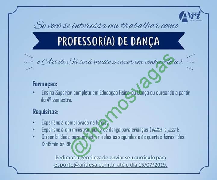– Interessados(as) e que atendam ao perfil solicitado acima, devem enviar o currículo para o e-mail esporte@aridesa.com.br 15/07/2019, colocando no título “Professor(a) de Dança”.