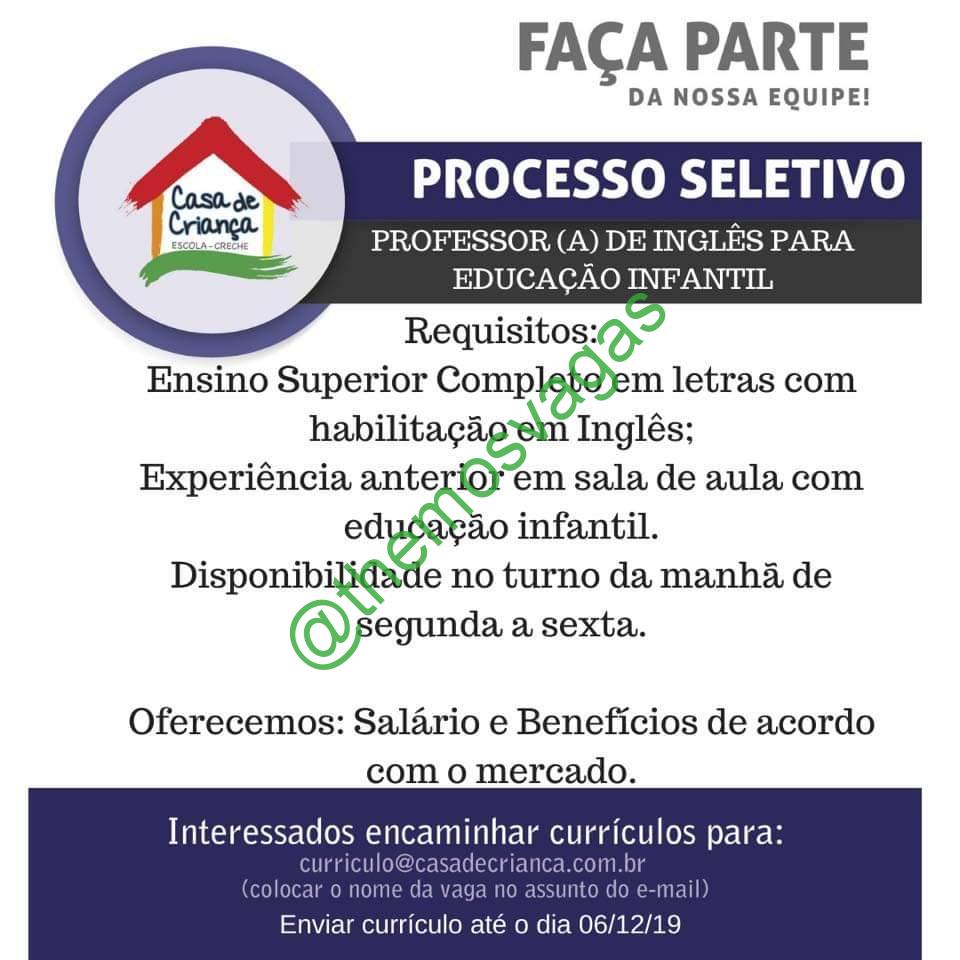 – Interessados(as) e que atendam ao perfil solicitado acima, devem até o dia 06/12/2019 enviar o currículo para o e-mail curriculo@casadecrianca..com.br , colocando no título “Professor(a) de Inglês”.