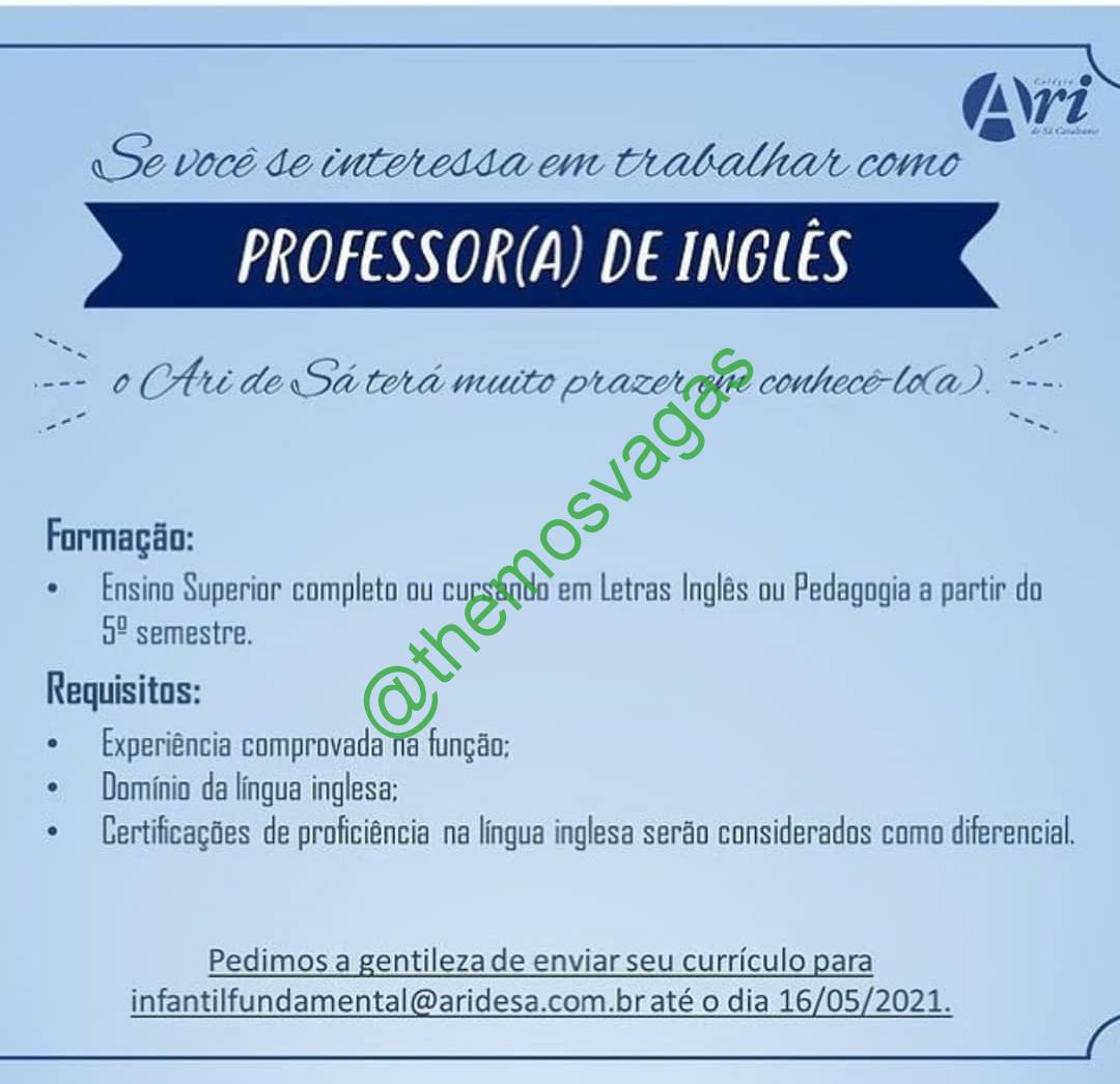 – Interessados(as) e que atendam ao perfil solicitado acima, devem enviar o currículo até 16|05|2021 para o e-mail infantilfundamental@aridesa.com.br, contendo no título/assunto “Professor(a) de Inglês – FOR”.