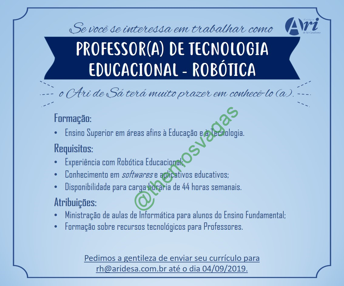 – Interessados(as) e que atendam ao perfil solicitado acima, devem enviar o currículo para o e-mail rh@aridesa.com.br até o dia 04/09/2019 , colocando no título “Professor(a) de Tecnologia”.
