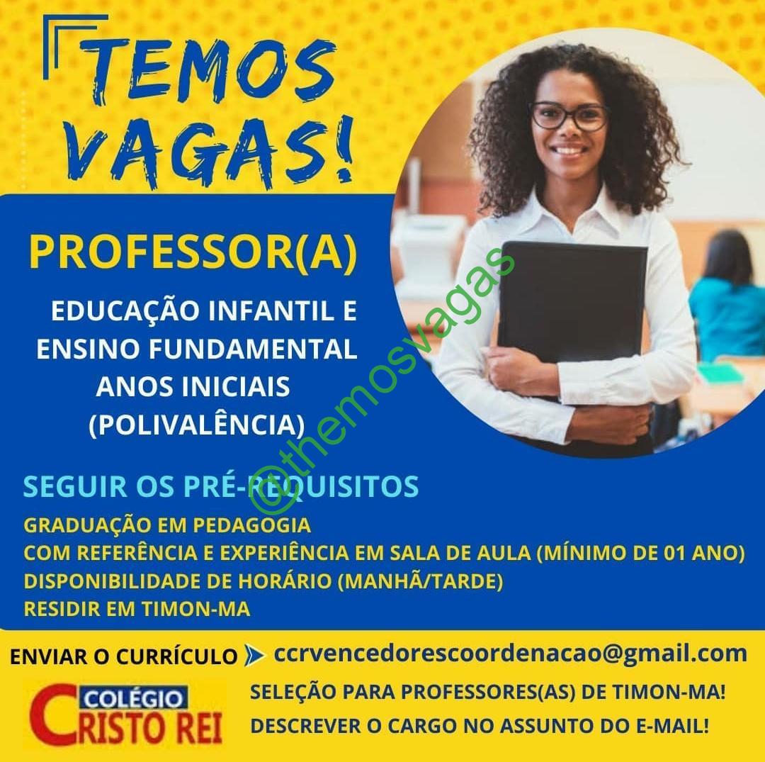 – Interessados(as) e que atendam ao perfil solicitado acima, devem enviar o currículo para o e-mail ccrvencedorescoordenacao@gmail.com, contendo no título/assunto “Professor(a) Polivalente – Timon“.