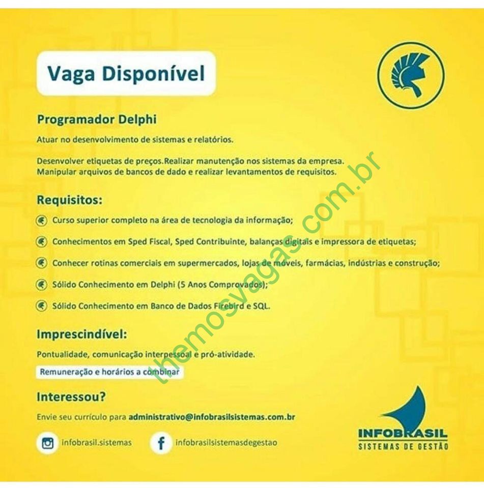 – Interessados(as) e que atendam ao perfil solicitado acima, devem enviar o currículo para o e-mail administrativo@infobrasilsistemas.com.br, colocando no título “Programador(a) Delphi”.