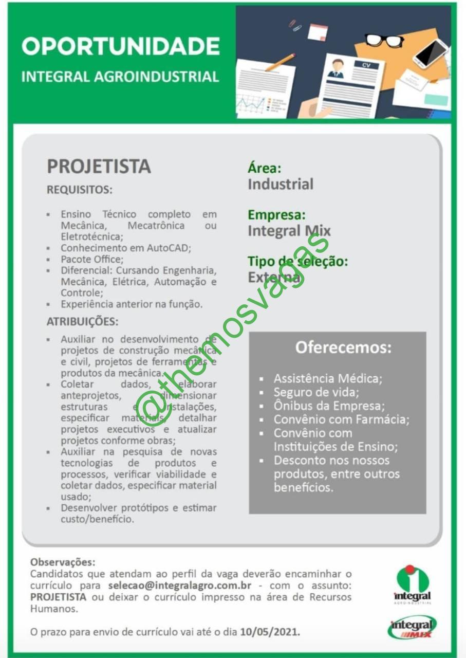– Interessados(as) e que atendam ao perfil solicitado acima, devem enviar o currículo até10|05|2021 para o e-mail selecao@integralagro.com.br, contendo no título/assunto “Projetista – FOR“.