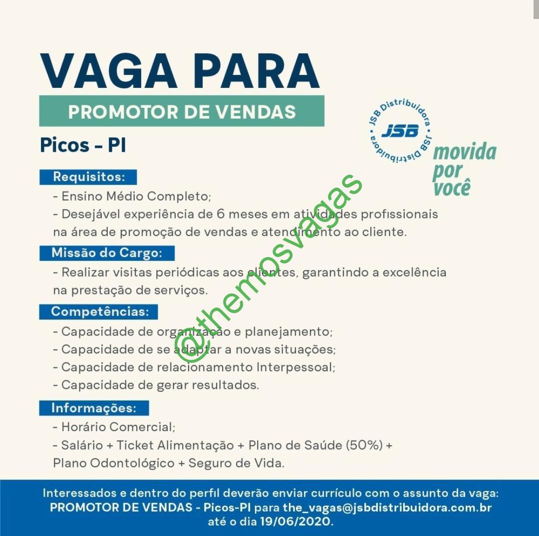 – Interessados(as) e que atendam ao perfil solicitado acima, devem enviar o currículo até 19/06/2020 para o e-mail the_vagas@jsbdistribuidora.com contendo no título/assunto “Promotor de Vendas –  Picos – PI