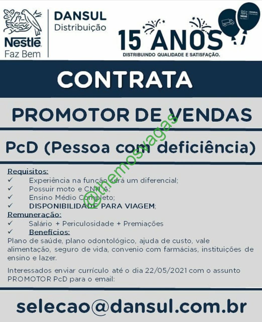 – Interessados(as) e que atendam ao perfil solicitado acima, devem enviar o currículo até 22/05/2021 para o e-mail selecao@dansul.com.br, contendo no titulo/assunto “Promotor de Vendas – FOR”.