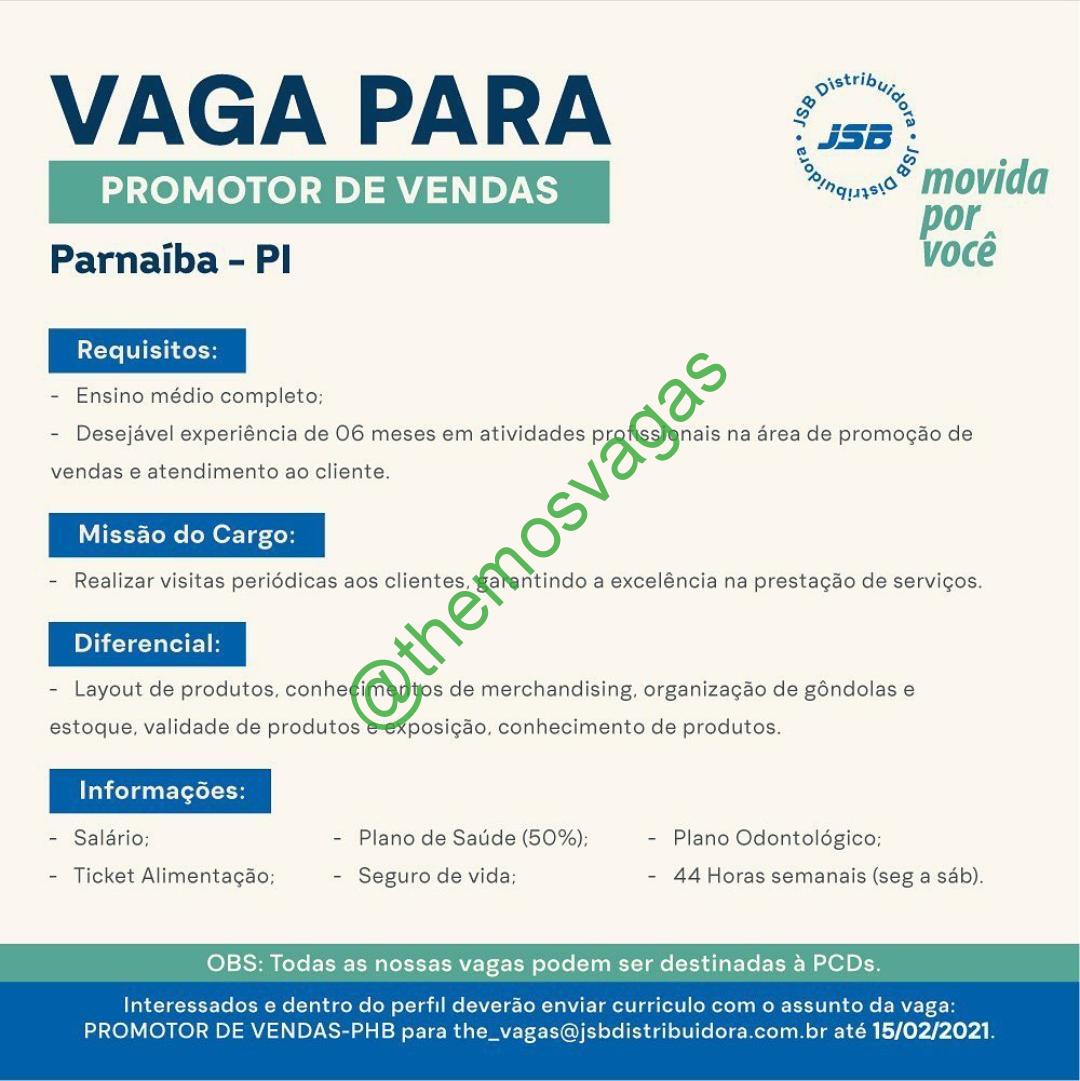 – Interessados(as) e que atendam ao perfil solicitado acima, devem enviar o currículo até 15/02/2021 para o e-mail the_vagas@jsbdistribuidora.com.br , contendo no título/assunto “Promotor de Vendas – PHB“.