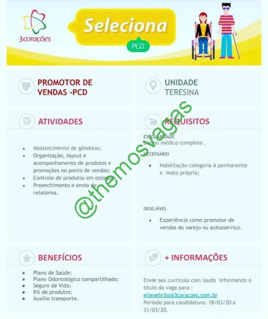 – Interessados(as) e que atendam ao perfil solicitado acima, devem enviar o currículo com laudo médicoaté 31/03/2020 para o e-mail elienebrito@3coracoes.com.br contendo no título/assunto “Promotor de Vendas PCD THE