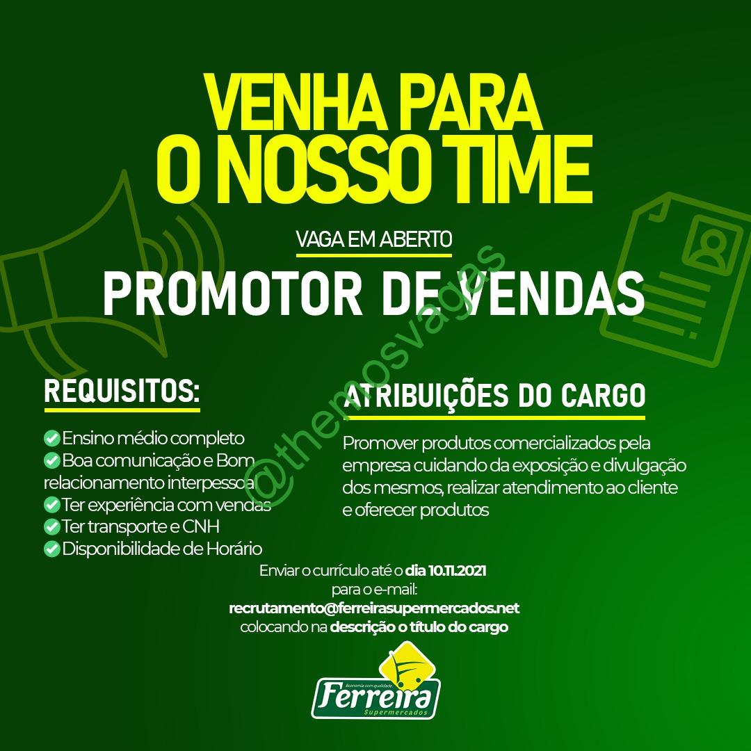 – Interessados(as) e que atendam ao perfil solicitado acima, devem enviar o currículo para o e-mail recrutamento@ferreirasupermercados.net, contendo no título/assunto “Promotor de Vendas – THE“.