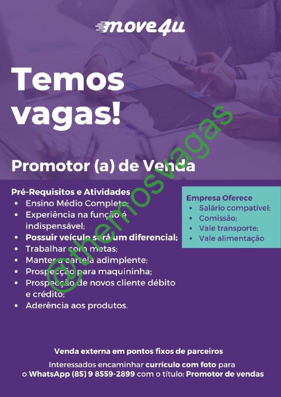 – Interessados(as) e que atendam ao perfil solicitado acima, devem enviar o currículo para o WhatsApp (85) 9.8559-2899, contendo no titulo/assunto “Promotor(a) de Vendas – FOR”