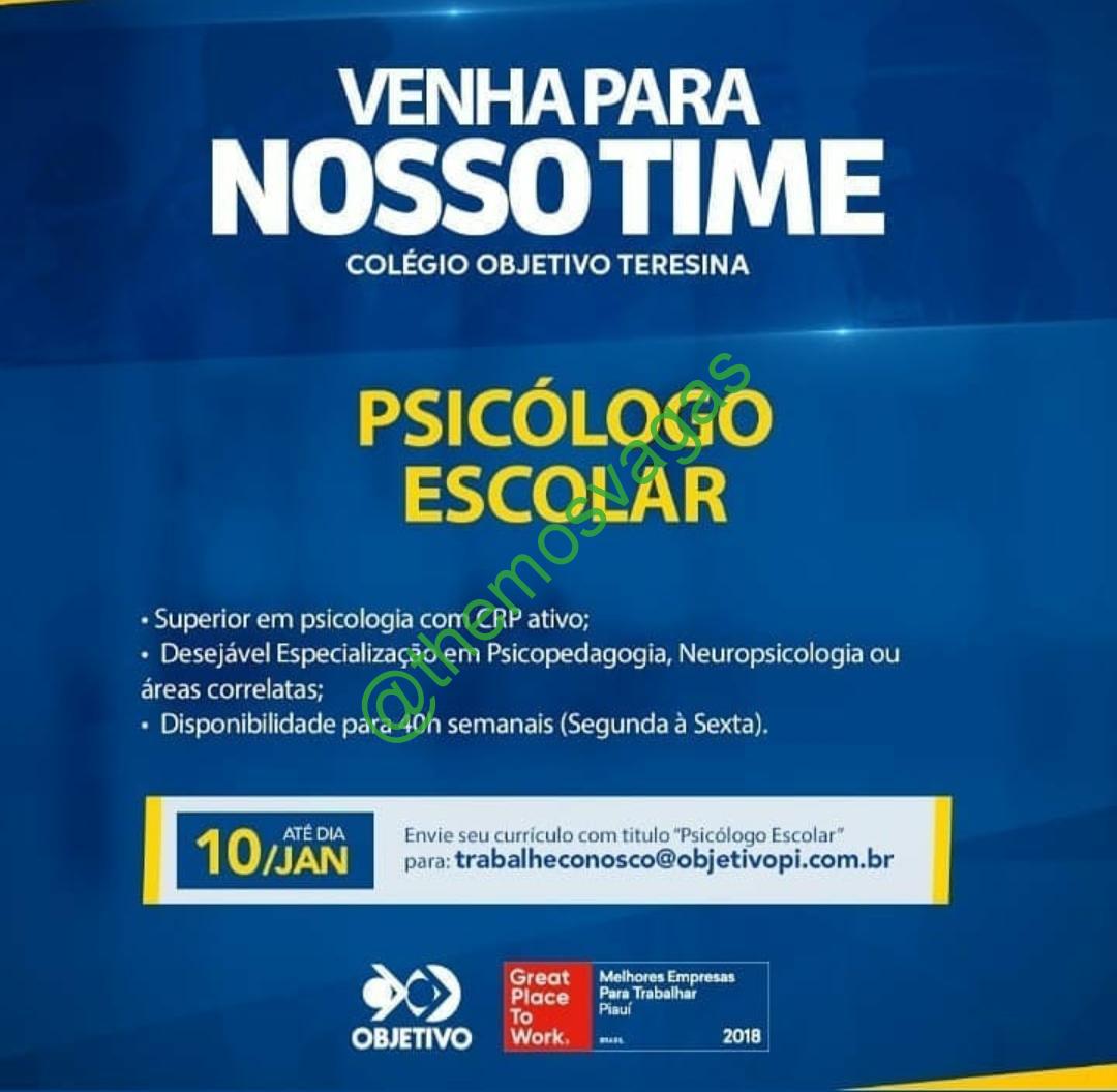 – Interessados(as) e que atendam ao perfil solicitado acima, devem enviar o currículo para o e-mail trabalheconosco@objetivopi.com.br , colocando no título/assunto: “Psicólogo(a) Escolar”.