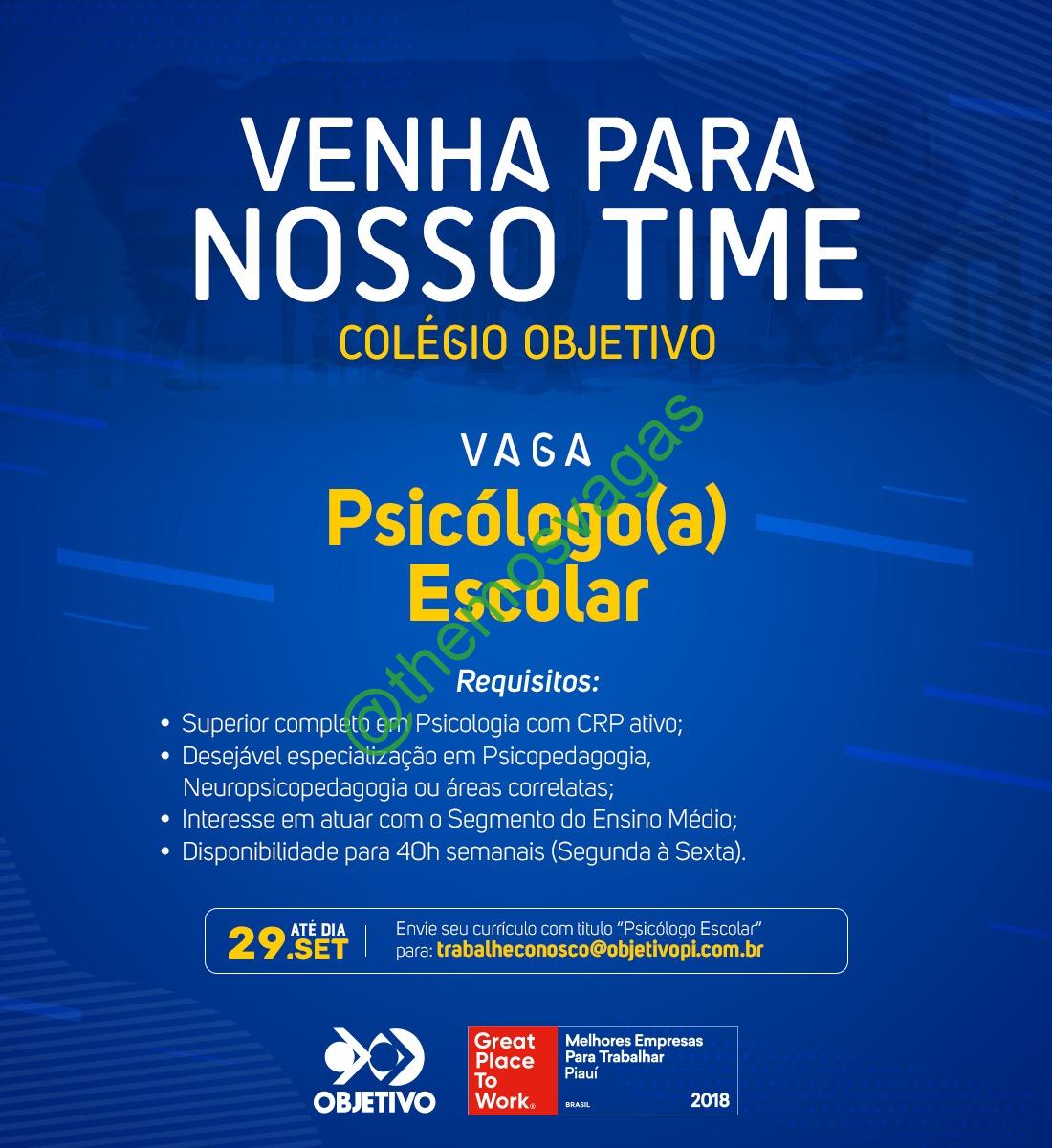 – Interessados(as) e que atendam ao perfil solicitado acima, devem enviar o currículo até 29/09/2019 para o e-mail trabalheconosco@objetivopi.com.br contendo no título/assunto “Psicólogo(a) Escolar THE“.
