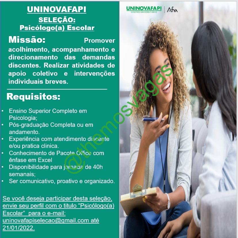 – Interessados(as) e que atendam ao perfil solicitado acima, devem enviar o currículo até 21/01/2022  para o e-mail uninovafapiselecao@gmail.com contendo no título/assunto “Psicólogo(a) Escolar