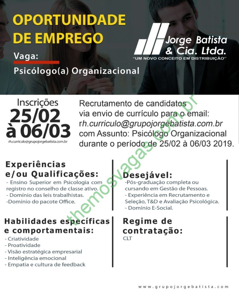 Interessados(as) e que atendam aos requisitos devem enviar o perfil profissional até o dia 06/03/2019, colocando no título do e-mail “Psicólogo(a) Organizacional”, para: rh.curriculo@grupojorgebatista.com.br