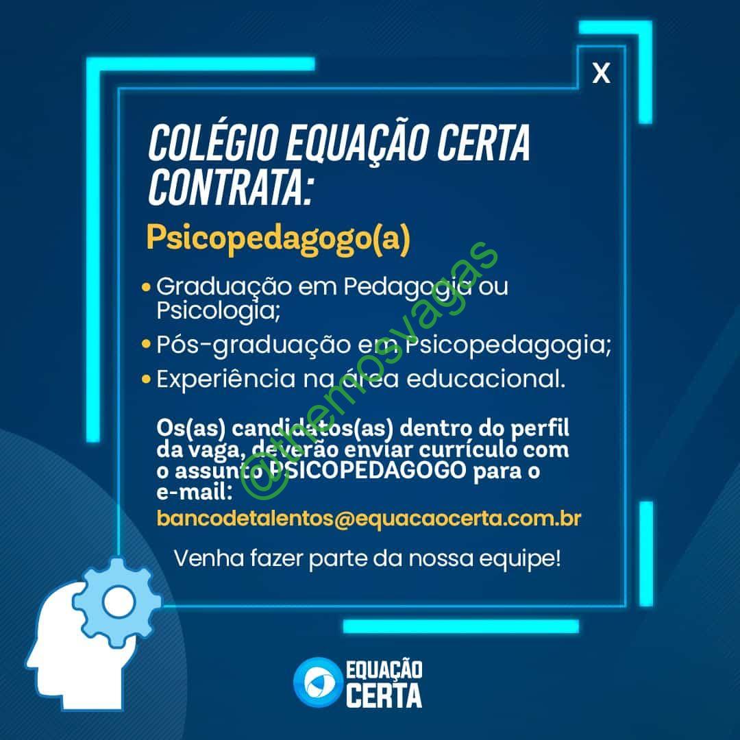 – Interessados(as) e que atendam ao perfil solicitado acima, devem enviar o currículo para o e-mail bancodetalentos@equacaocerta.com.br contendo no título/assunto “Psicopedagogo(a)