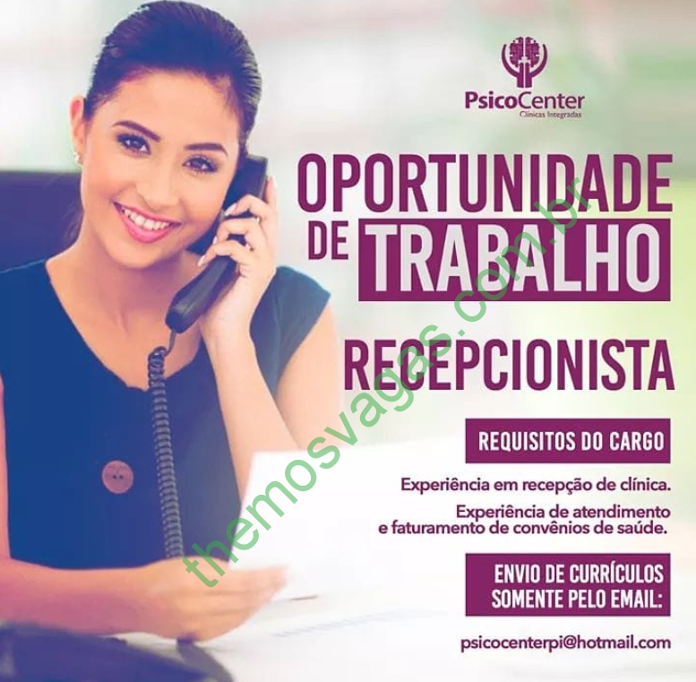 – Interessados(as) e que atendam aos requisitos devem enviar o perfil profissional, colocando no título do e-mail “Recepcionista”, para: psicocenterpi@hotmail.com