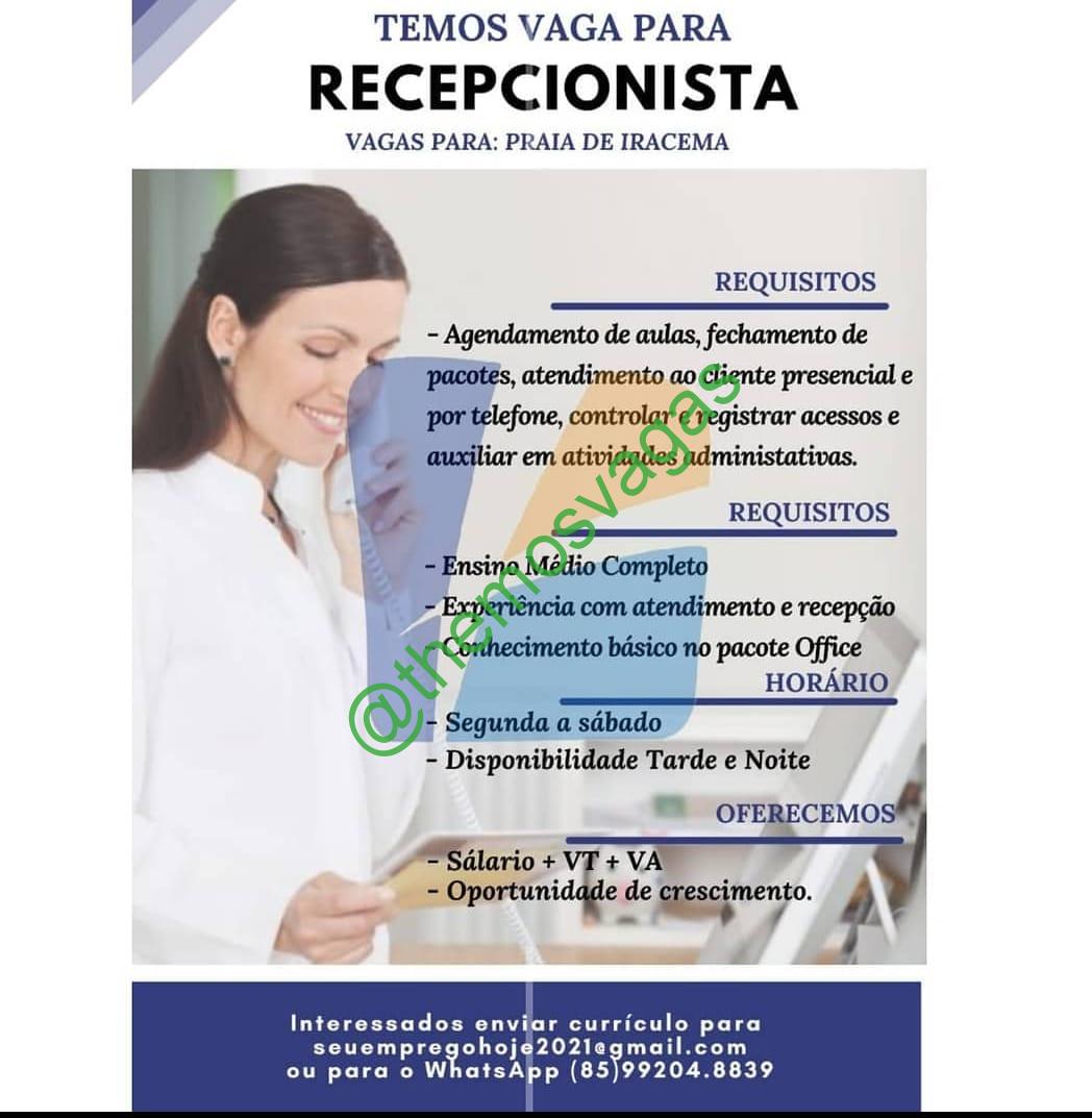 – Interessados(as) e que atendam ao perfil solicitado acima, devem enviar o currículo para o e-mail seuempregohoje2021@gmail.com, contendo no titulo/assunto “Recepcionista – FOR”