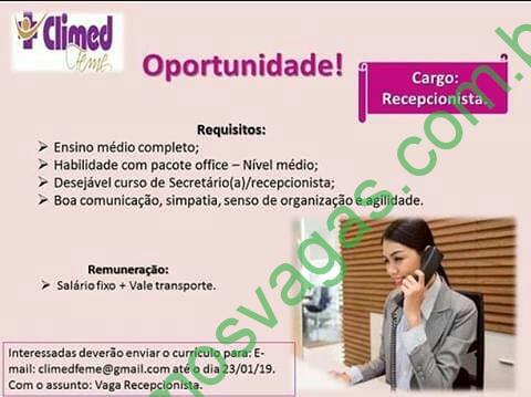 Interessados(as) e que atendam aos requisitos devem enviar o perfil profissional até o dia 23/01/2019, colocando no título do e-mail “Vaga Recepcionista”, para o e-mail: climedfeme@gmail.com
