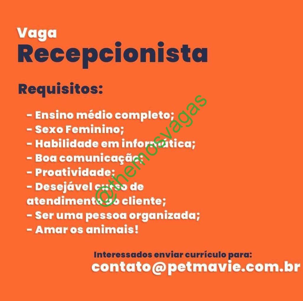 – Interessados(as) e que atendam ao perfil solicitado acima, devem enviar o currículo para o e-mail contato@petmavie.com.br e petcheriephb@gmail.com contendo no título/assunto “Recepcionista PHB