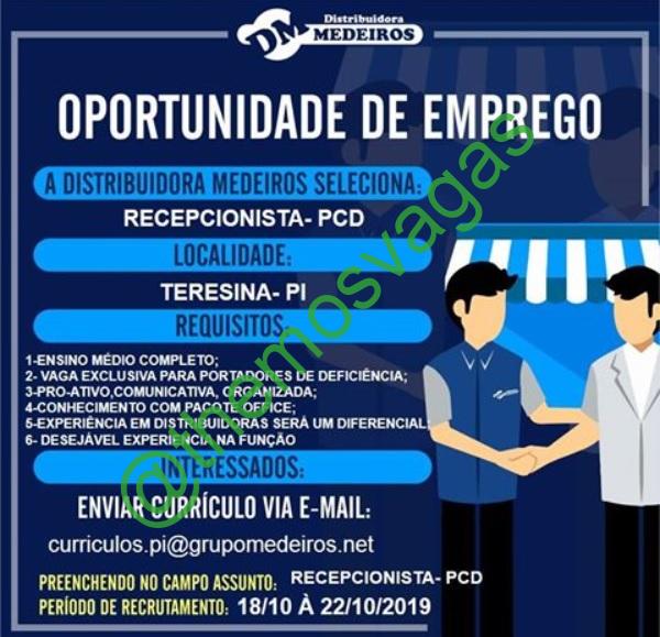 – Interessados(as) e que atendam ao perfil solicitado acima, devem enviar o currículo até 22/10/2019 para o e-mail curriculos.pi@grupomedeiros.net contendo no título/assunto “Recepcionista PCD“.