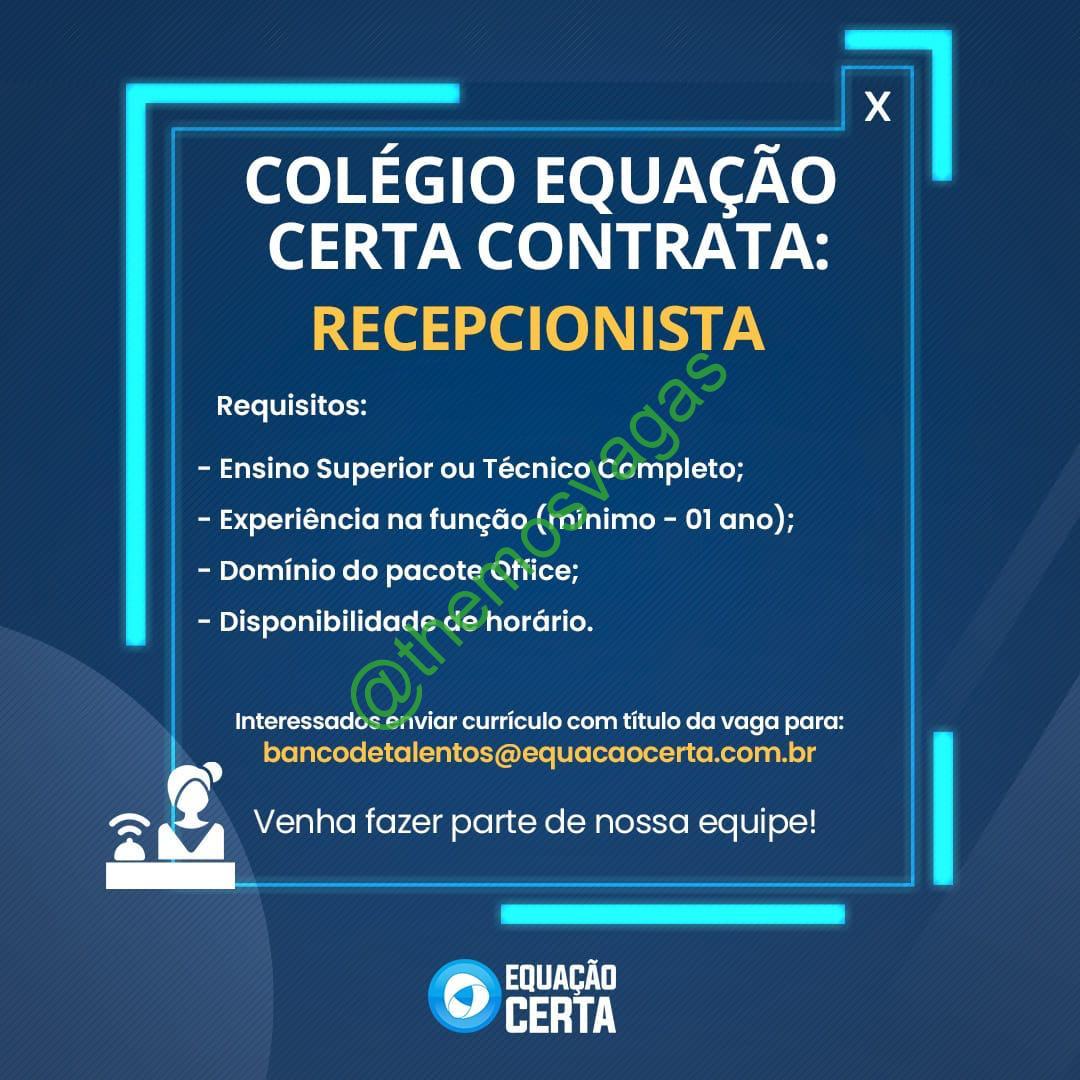 – Interessados(as) e que atendam ao perfil solicitado acima, devem enviar o currículo para o e-mail bancodetalentos@equacaocerta.com.br contendo no título/assunto “Recepcionista – THE“.