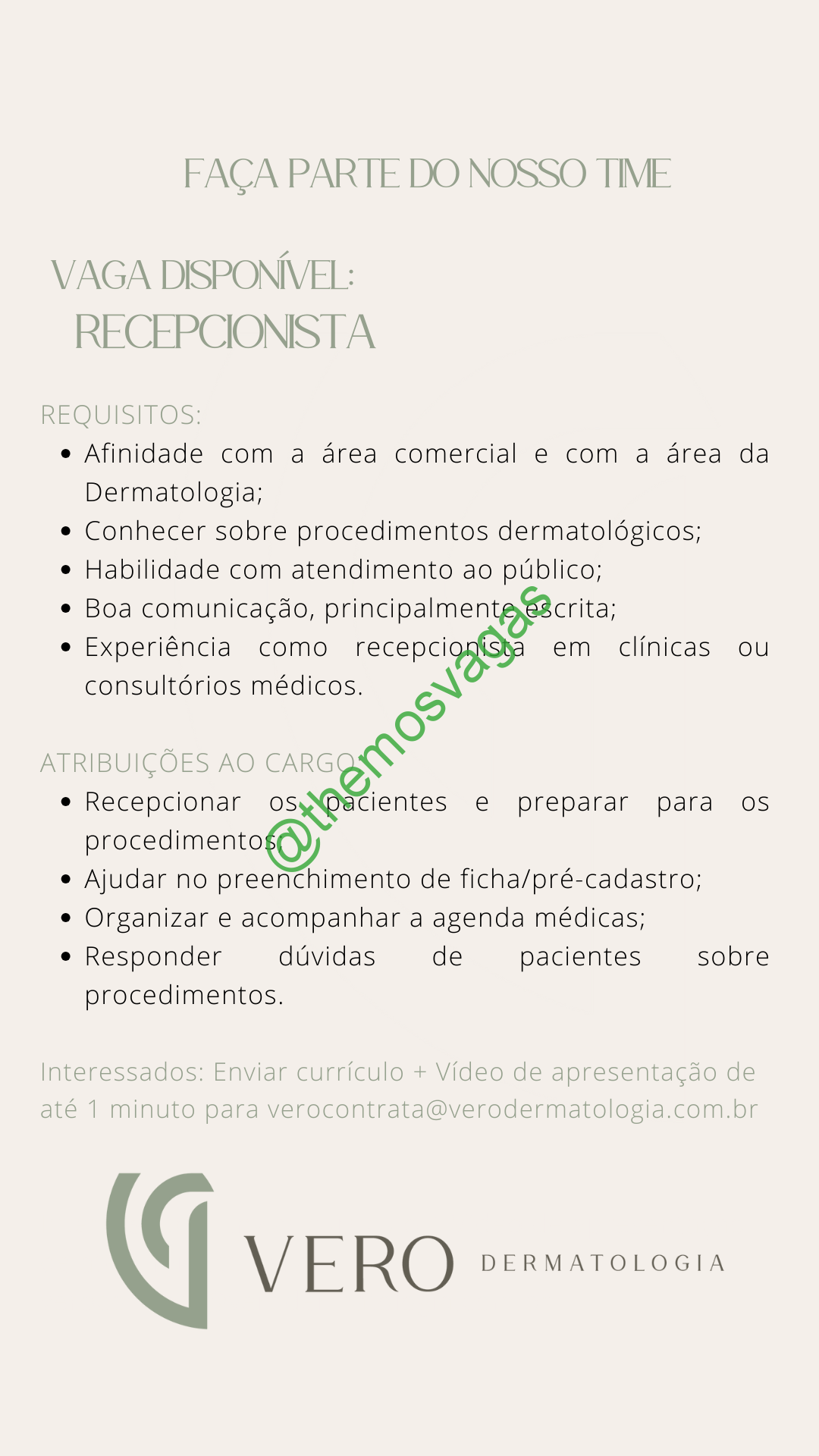 – Interessados(as) e que atendam ao perfil solicitado acima, devem enviar o currículo + vídeo de apresentação de 1 até minuto para o e-mail verocontrata@verodermatologia.com.br contendo no título/assunto “Recepcionista – THE“.
