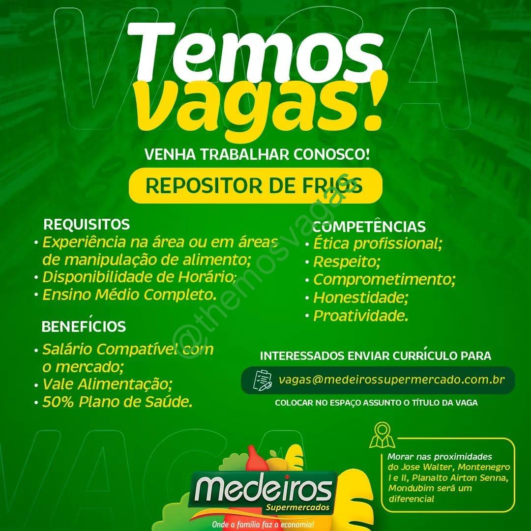 – Interessados(as) e que atendam ao perfil solicitado acima, devem enviar o currículo para o e-mail vagas@medeirossupermercado.com.br, contendo no titulo/assunto “Repositor de Frios – FOR”.
