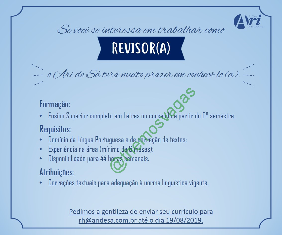 – Interessados(as) e que atendam ao perfil solicitado acima, devem enviar o currículo para o e-mail rh@aridesa.com.br até o dia 19/08/2019 , colocando no título “Revisor(a)”.