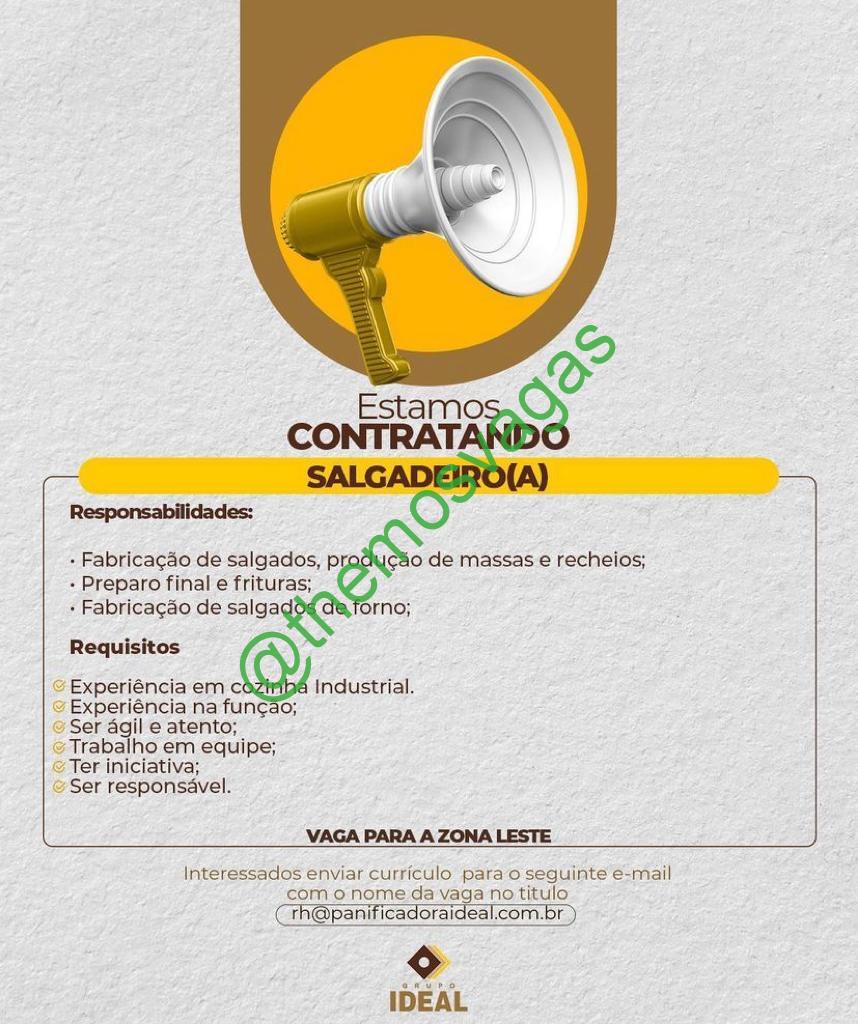 – Interessados(as) e que atendam ao perfil solicitado acima, devem enviar o currículo para o e-mail rh@panificadoraideal.com.br contendo no título/assunto “Salgadeiro(a) – THE“.