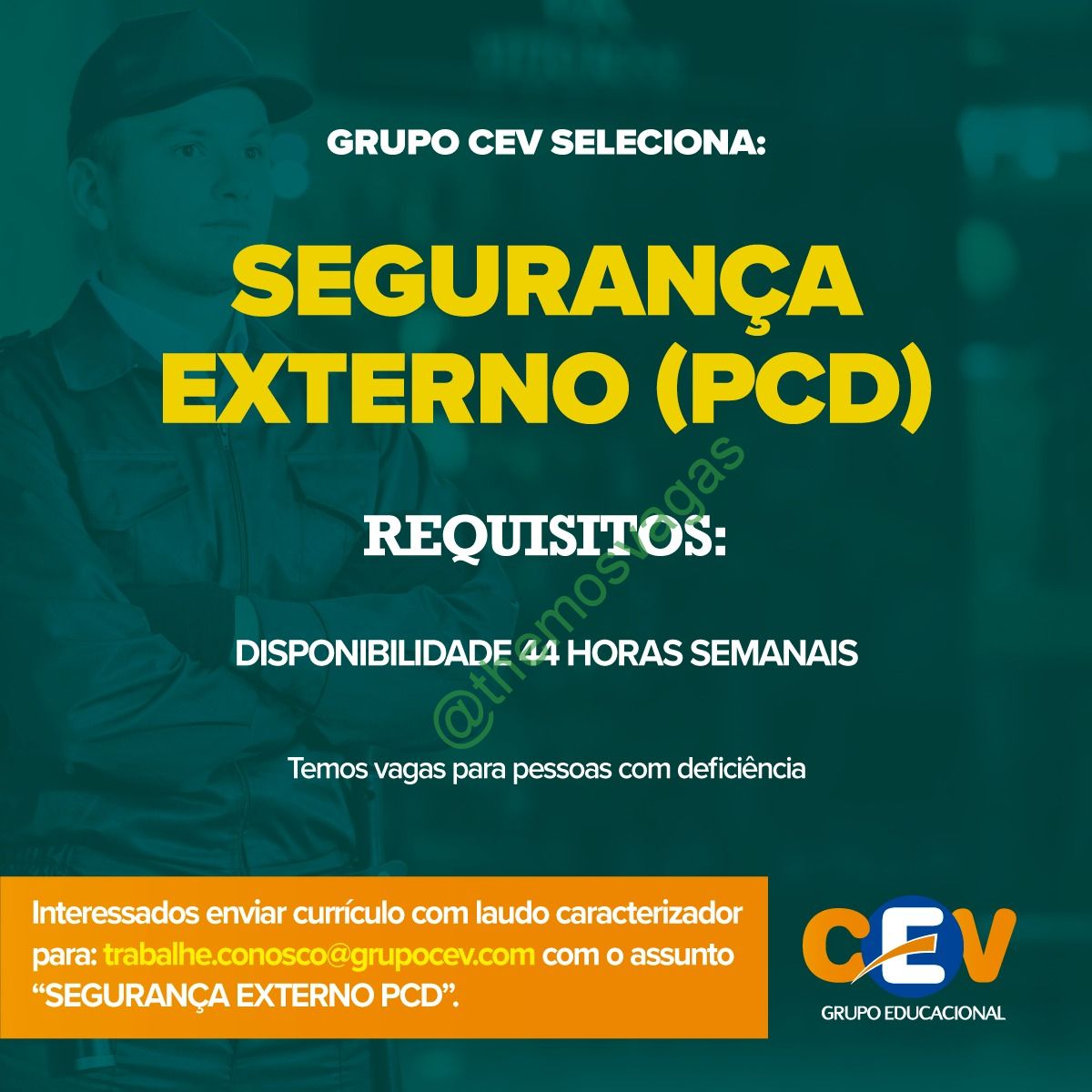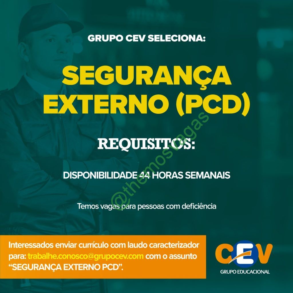 – Interessados(as) e que atendam ao perfil solicitado acima devem enviar o currículo para o e-mail trabalhe.conosco@grupocev.com contendo no título “Segurança Externo PCD“.