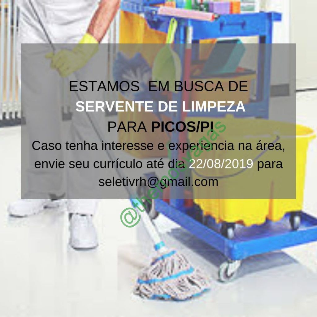 – Interessados(as) e que atendam ao perfil solicitado acima, devem enviar o currículo até 22/08/2019 para o e-mail seletivrh@gmail.com contendo no título/assunto “Servente de Limpeza Picos”.