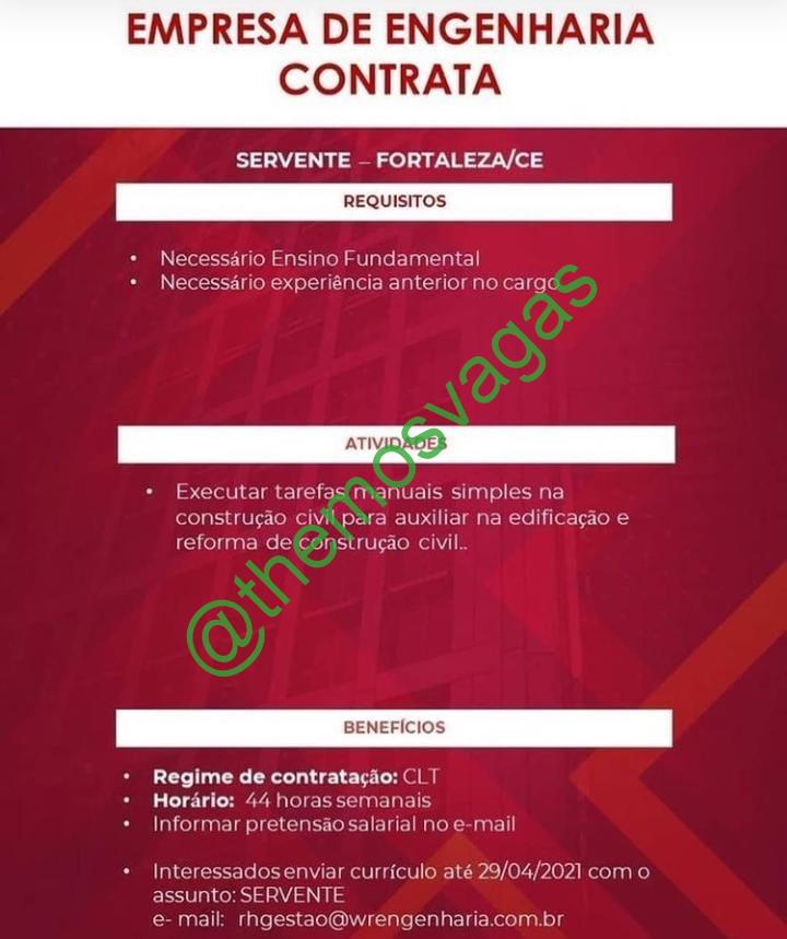 – Interessados(as) e que atendam ao perfil solicitado acima, devem enviar até o dia 29|04|2021 o currículo para o e-mail rhgestao@wrengenharia.com.br, contendo no título/assunto “Servente – FOR”.