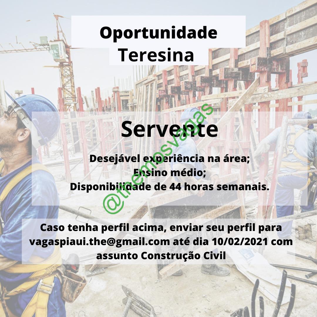 – Interessados(as) e que atendam ao perfil solicitado acima, devem enviar o currículo até 10/02/2021 para o e-mail vagaspiaui.the@gmail.com contendo no título/assunto “Construção Civil – Servente – THE