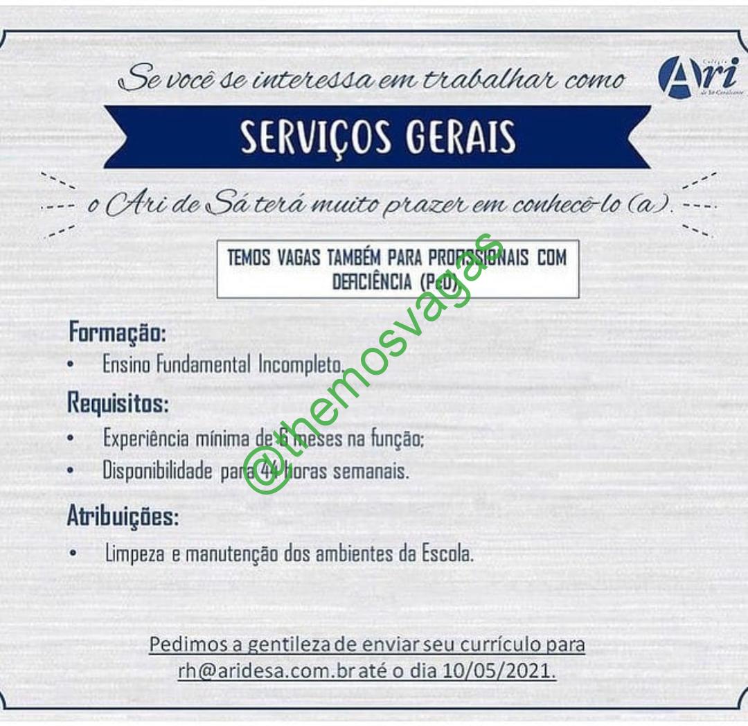 – Interessados(as) e que atendam ao perfil solicitado acima, devem enviar o currículo até 10|05|2021 para o e-mail rh@aridesa.com.br, contendo no título/assunto “Serviços Gerais – FOR“.