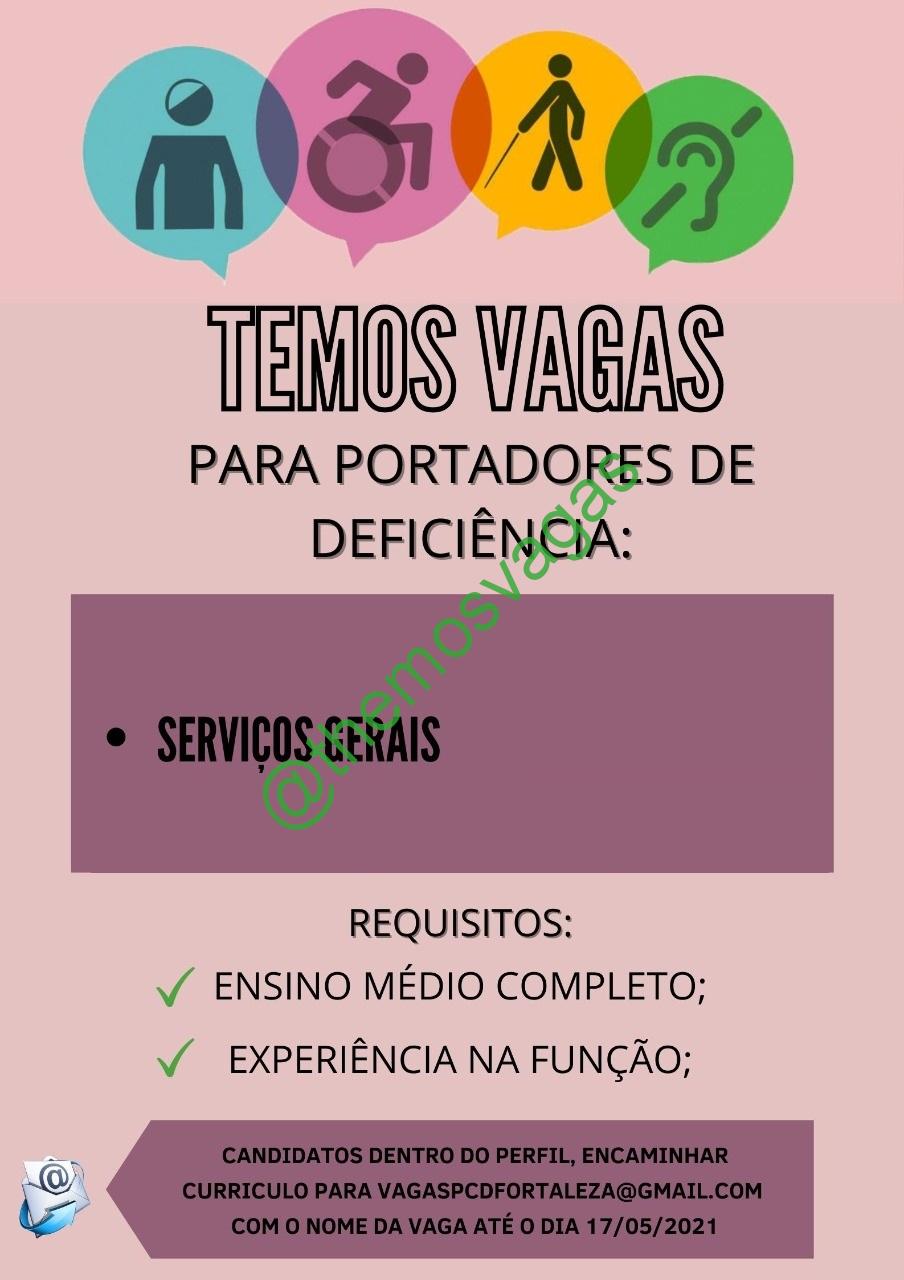 – Interessados(as) e que atendam ao perfil solicitado acima, devem enviar o currículo até 17/05/2021 para o e-mail vagaspcdfortaleza@gmail.com, contendo no título/assunto “Serviços Gerais – FOR“.