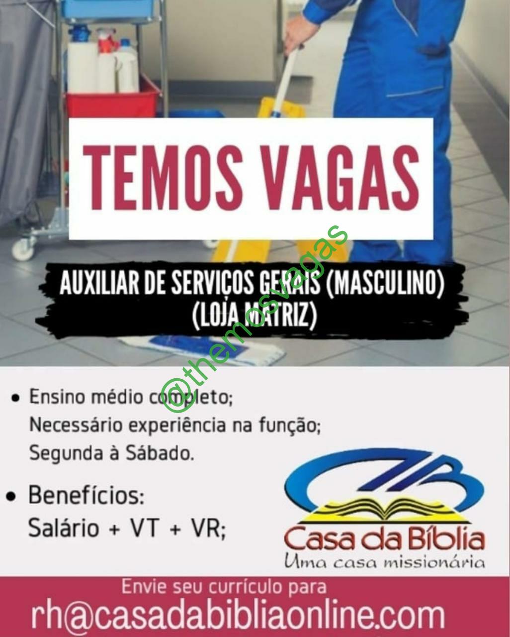 – Interessados(as) e que atendam ao perfil solicitado acima, devem enviar o currículo  para o e-mail rh@casadabibliaonline.com , colocando no título/assunto “Aux Serviços Gerais – FOR