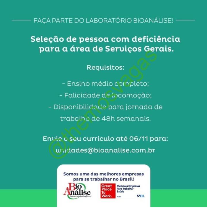 – Interessados(as) e que atendam ao perfil solicitado acima, devem enviar o currículo até 06/11/2019 para o e-mail unidades@bioanalise.com.br contendo no título/assunto “Serviços Gerais PCD THE“.