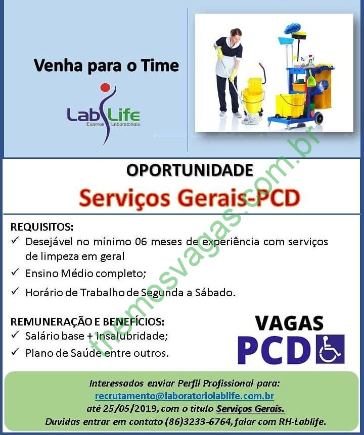 – Interessados(as) e que atendam aos requisitos devem enviar o perfil profissional até o dia 25/05/2019, colocando no título do e-mail “Serviços Gerais”, para: recrutamento@laboratoriolablife.com.br