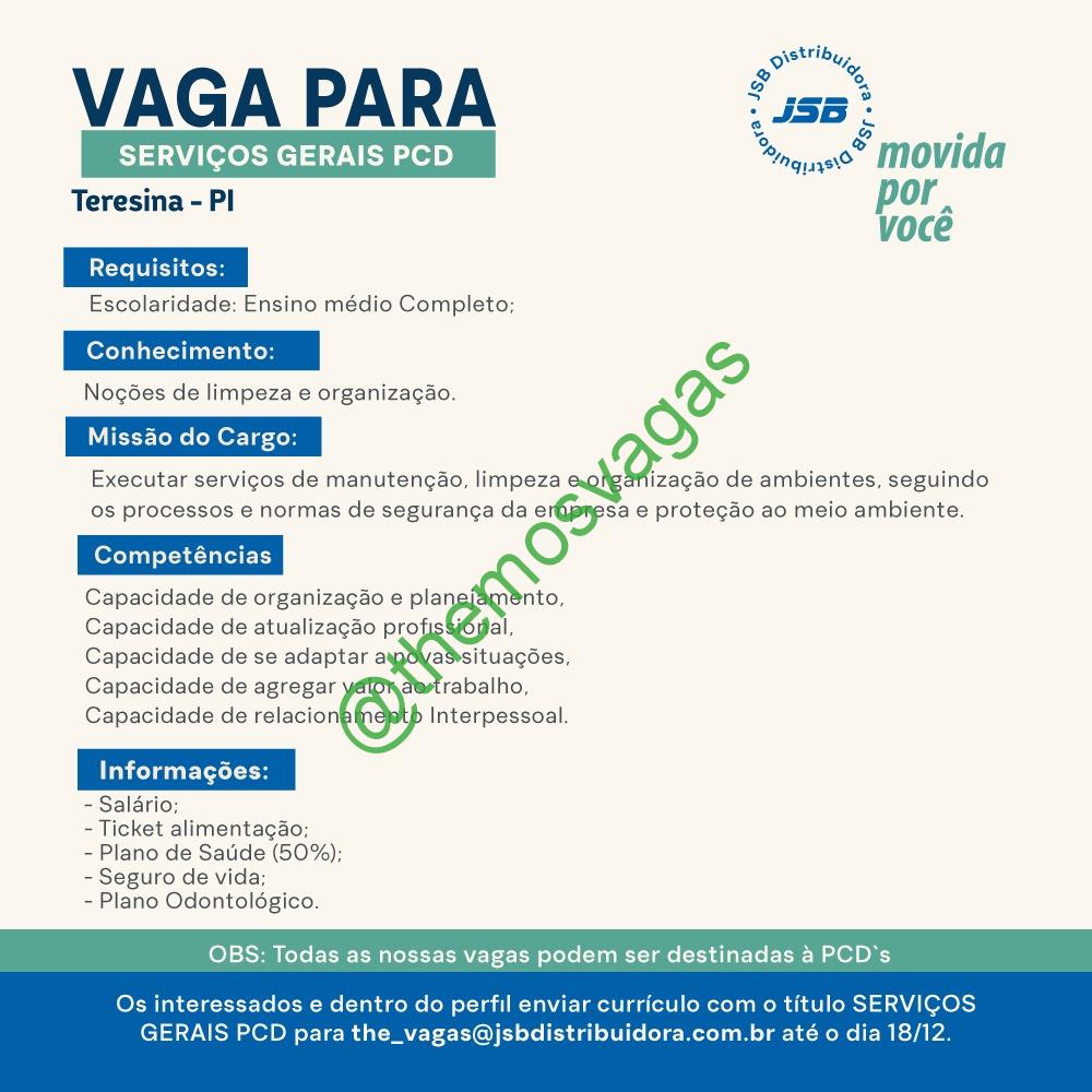 – Interessados(as) e que atendam ao perfil solicitado acima, devem enviar o currículo até 18/12/2020 para o e-mail the_vagas@jsbdistribuidora.com.br contendo no título/assunto “Serviços Gerais PCD– THE“.