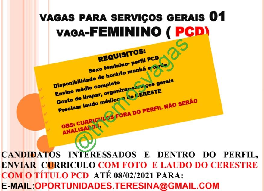 – Interessados(as) e que atendam ao perfil solicitado acima, devem enviar o currículo com foto e laudo do CERESTRE até 08/02/2021 para o e-mail oportunidades.teresina@gmail.com contendo no título/assunto “Serviços Gerais PCD THE