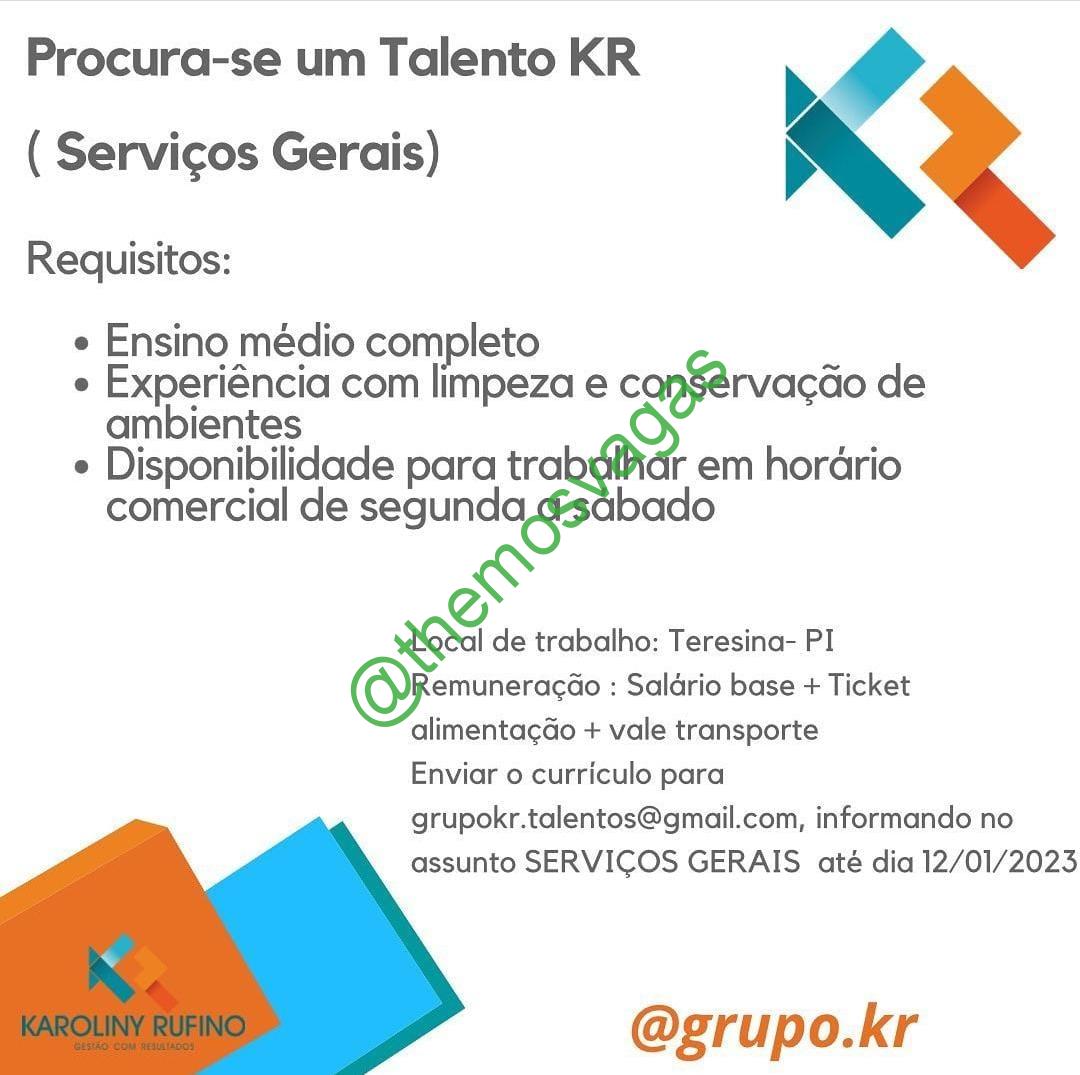 – Interessados(as) e que atendam ao perfil solicitado acima, devem enviar o currículo até 12/01/2023 para o e-mail grupokr.talentos@gmail.com contendo no título/assunto “Serviços Gerais“.