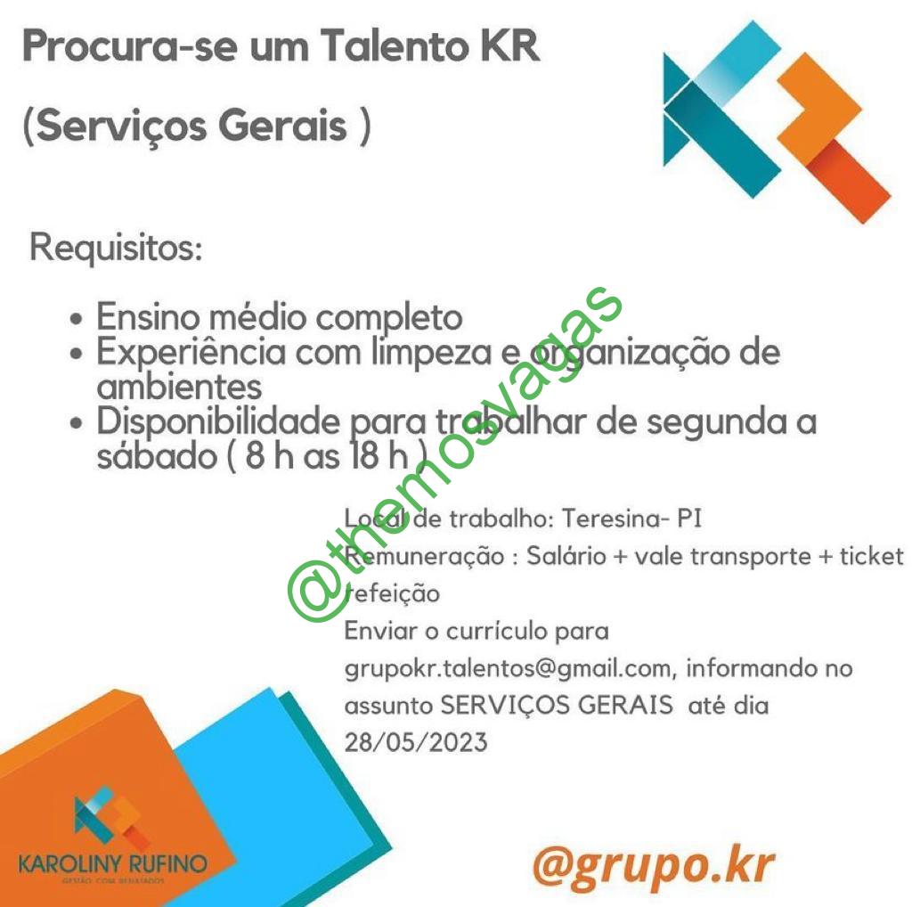 – Interessados(as) e que atendam ao perfil solicitado acima, devem enviar o currículo até 28/05/2023 para o e-mail grupokr.talentos@gmail.com contendo no título/assunto “Serviços Gerais“.